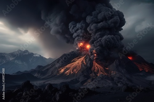 Fototapeta premium A volcanic eruption in the mountains with a column of lava and smoke. Generative AI