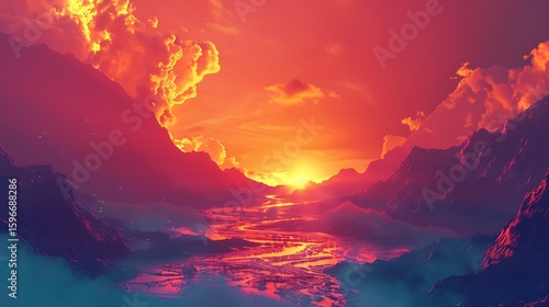 © FOYSAL, Naklejka premium A volcanic landscape with flowing lava and intense heat