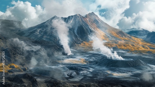 Naklejka premium A Volcanic Landscape with Steam Rising from Craters