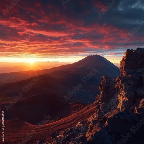 © nontawat, Fototapeta premium a volcanic sunrise, with vibrant hues of red and orange filling the sky as the sun rises over the peak