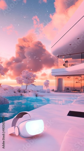 © Bassmallah, Fototapeta premium A VR headset sits on a table overlooking a futuristic pool and modern home against a pink sunset sky.