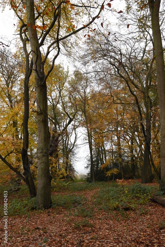 Fototapeta premium a walk though piper's hill and Dodderhill common forest also known as Hanbury woods with the leaves coloured orange during autumn