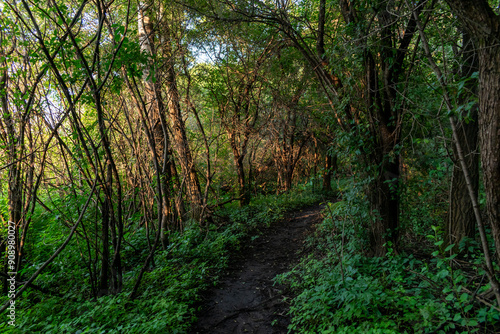 Naklejka premium A walking path to the horizon in a local state park surrounded by lush greenery.