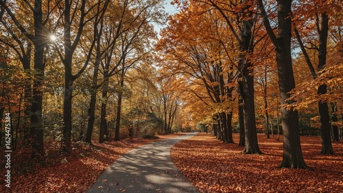 © The 2R Artificiality, Naklejka premium A walkway traversing the park's core, flanked by lofty trees