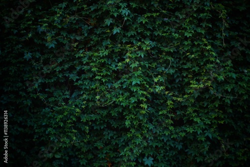 © M Halim Abduh, Obraz premium A wall completely covered in green ivy with a few purple flowers. The leaves are lush and vibrant, creating a natural, textured background.