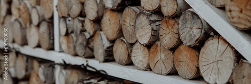 Naklejka premium A wall made of timber trunks, abundant in wood and soil. Banner for website...