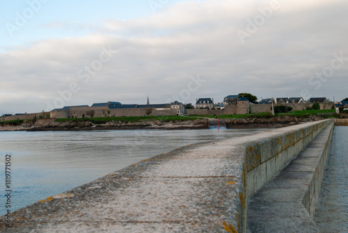 © Annick, Fototapeta premium A wall of concrete blocks overlooks a body of water