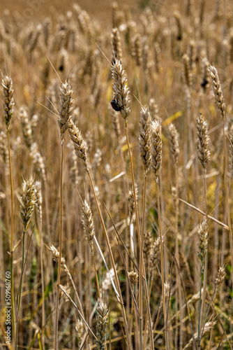 Fototapeta premium A wall of ears of wheat already yellowed, but not yet ripe.