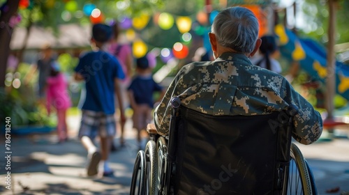© Sasint, Obraz premium A war veteran sitting in a wheelchair, watching children play happily