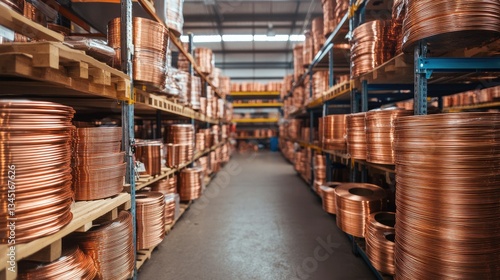 Fototapeta premium A warehouse filled with copper wire coils, meticulously arranged for...