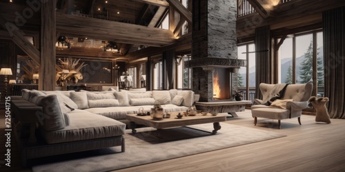 Fototapeta premium A warm and inviting living room filled with comfortable furniture and a crackling fire in the fireplace. Perfect for creating a cozy atmosphere in any home