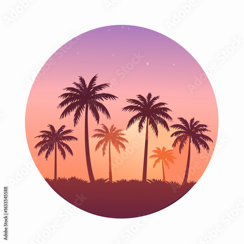 Naklejka premium A warm circular sunset scene with palm silhouettes along a tropical...