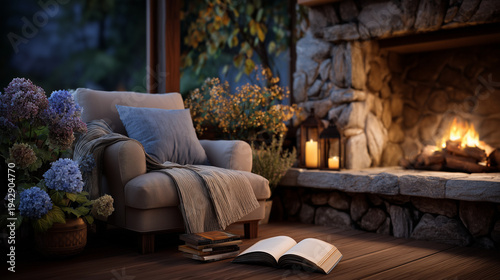 Fototapeta premium A warm evening reading scene beside a fireplace where an open book lies on a comfortable armchair