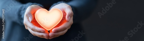 Fototapeta premium A warm glowing heart held gently in hands, symbolizing love, kindness, and compassion against a dark background.
