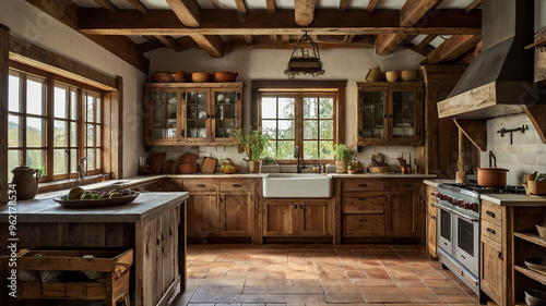 Naklejka premium A Warm, Rustic Kitchen With Wooden Beams, Farmhouse-style Cabinets, And...
