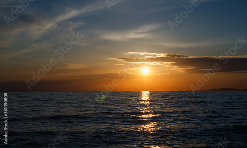 © sergeikorolev, Naklejka premium A warm sunset over the sea horizon.