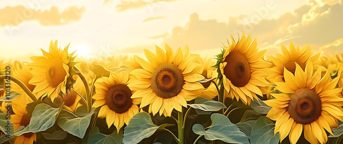 © john, Obraz premium A warm-toned illustration of a bright, golden field full of large, blooming sunflowers under a yellow sky