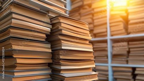 Fototapeta premium A warm-toned image of stacked books, showcasing their textured spines and pages in a cozy, well-lit library setting.A close-up of medical records in a file cabinet, focusing on the various files and d