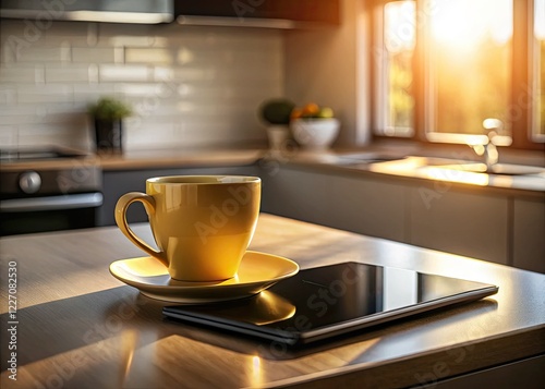 © Autun, Obraz premium A warm yellow mug cozies up on a sleek black tablet, a modern kitchen scene.
