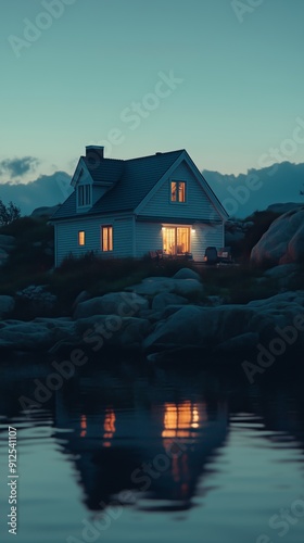 Fototapeta premium A warmly lit cabin by a serene lake at dusk, reflecting tranquility and...