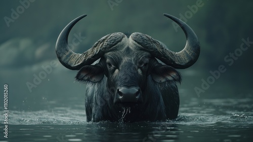 Naklejka premium A water buffalo wades through a misty, serene landscape.