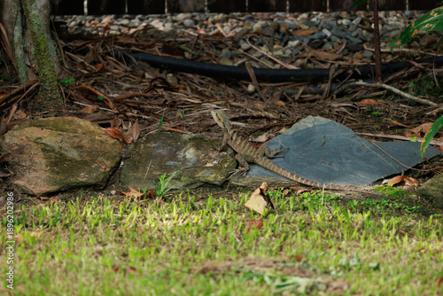 © WendlerCanning Photo, Obraz premium A Water Dragon is laying on a rock in a grassy area