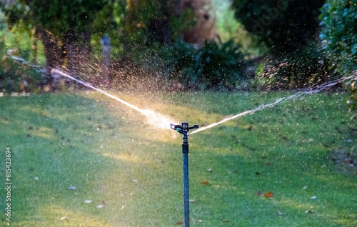 Naklejka premium A water sprayer silhouetted against the early morning sun watering an out of...