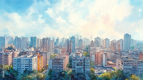 Obraz premium A watercolor cityscape portrays a city with gray buildings under a clear blue...