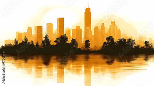© Siasart Stock, Obraz premium A watercolor cityscape silhouette with a reflection in the water.
