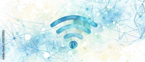 © JK_kyoto, Obraz premium A watercolor clipart of a glowing WiFi symbol set against a simplified network grid background The grid features abstract