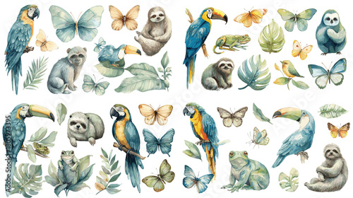 Naklejka premium A watercolor collection of tropical animals, butterflies, parrots, sloths, frogs, and jungle leaves, perfect for nature themes, children's designs, botanical art, and wildlife illustration projects.