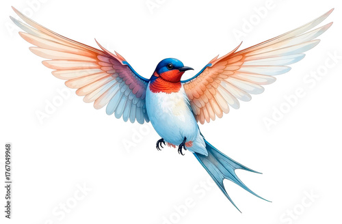 © alexandra nova, Fototapeta premium A watercolor illustration depicting the grace of a swallow in flight. The bright blue and white plumage of the bird is isolated on a white background, embodies grace and freedom.