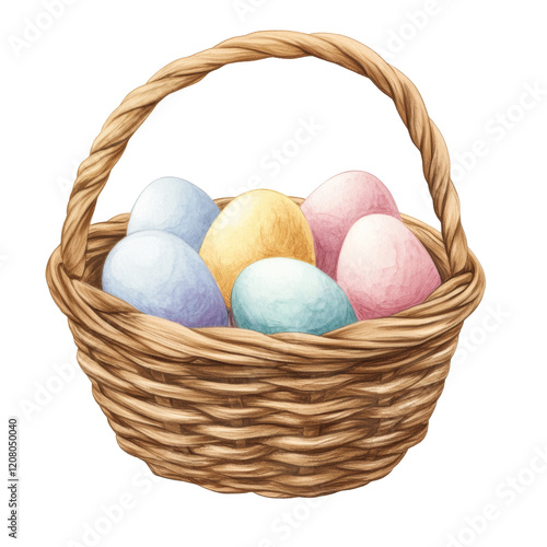 Naklejka premium A watercolor illustration depicts a brown woven basket filled with pastel-colored Easter eggs.