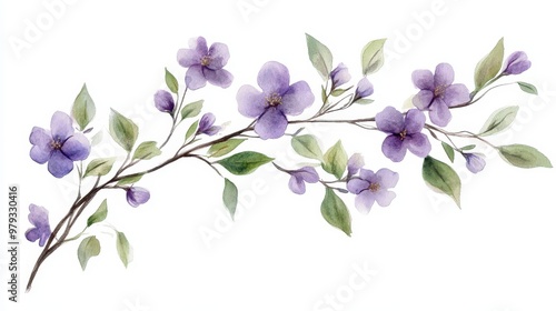 © Boinah, Obraz premium A watercolor illustration of delicate purple flowers and green leaves.