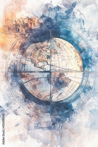© Natalia, Obraz premium A watercolor illustration of the Earth divided by the Prime Meridian, surrounded by artistic washes of blue and orange tones, symbolizing global exploration and unity