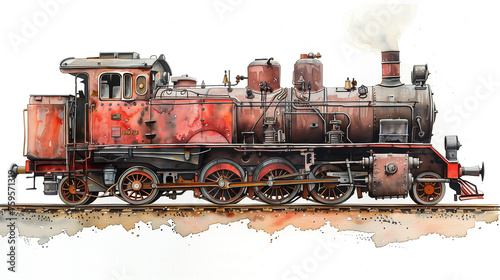 © RisingSun, Naklejka premium A Watercolor of a Rustic Steam Locomotive Leaving a Country Stop, on White Background