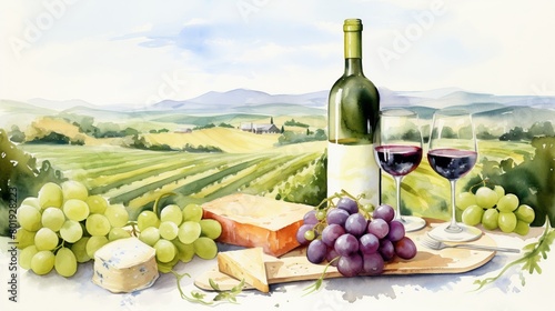 Fototapeta premium A watercolor of Vineyard tour essentials, wine bottle, grapes, cheese platter, glasses in a lush vineyard watercolor