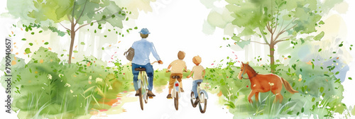 © sommersby, Fototapeta premium A watercolor painting depicting a man riding a bike with two children, enjoying a leisurely outing together