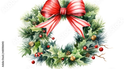 © Anna, Fototapeta premium a watercolor painting of a christmas wreath with a red bow and holly wreath with pine cones, berries, and pine cones with a red ribbon on a white background.