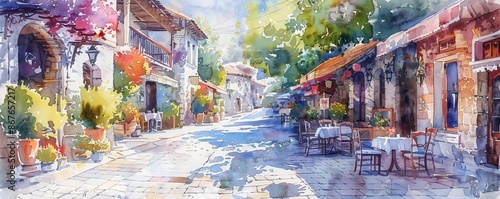 © Svitlana, Fototapeta premium A watercolor painting of a quaint cobblestone street lined with charming shops, cafes, and old-fashioned buildings.