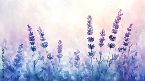 © ThuyTrang, Naklejka premium A watercolor painting of blueberry and lavender botanical border, soft blues and purples, delicate green stems, light countryside background, glowing sunlight. Created Using: watercolor brushes,