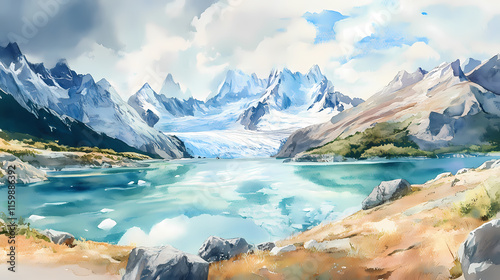 © Thiago, Obraz premium A watercolor painting of los glaciares national park in argentina, featuring the stunning perito moreno glacier, rugged mountains, and crystal-clear lakes. Glaciered. Illustration