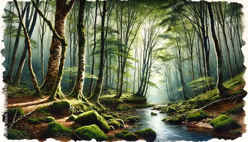 Fototapeta premium A watercolor painting of the Hyrcanian Forests, showcasing dense woodlands, soft sunlight, and a gently flowing river.