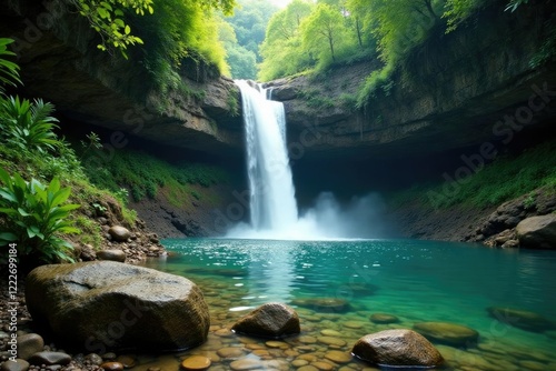 © สิริวุฒิ นาคโคตร, Naklejka premium A waterfall cascades down a rocky slope behind a natural pool in a rainforest clearing, rock, jungle, waterfall
