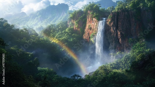 © sarun, Fototapeta premium A waterfall cascading down a steep cliff, with a rainbow visible in the mist at the base, surrounded by dense greenery.