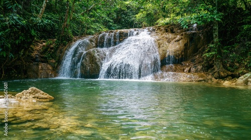 © soem, Fototapeta premium A waterfall cascading down into a serene pool of water in the forest.
