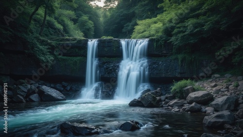Fototapeta premium A waterfall in a lush green forest with flowing water and rocks, capturing a...