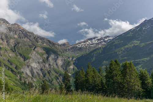 Fototapeta premium A waterfall in the Alps near Piz Beverin in Switzerland at the center of a valley - 1