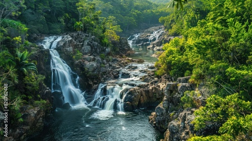 © caucul, Obraz premium A waterfall is flowing into a lake surrounded by trees