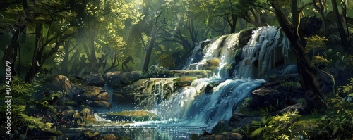 © Dalibor, Fototapeta premium A waterfall is seen through a window in a lush green forest. Free copy space for text.